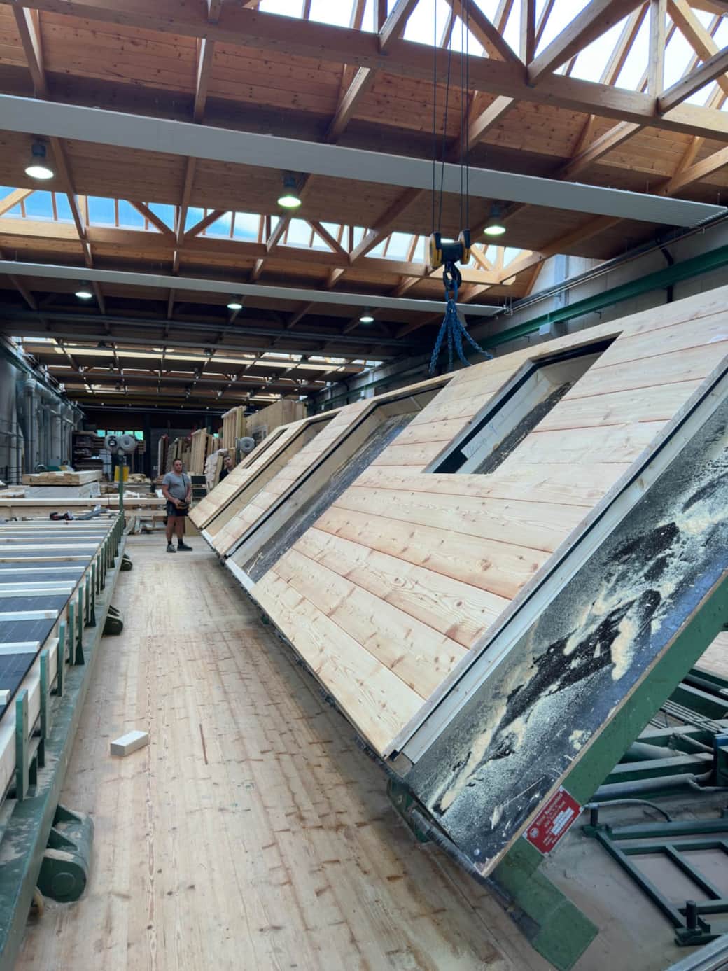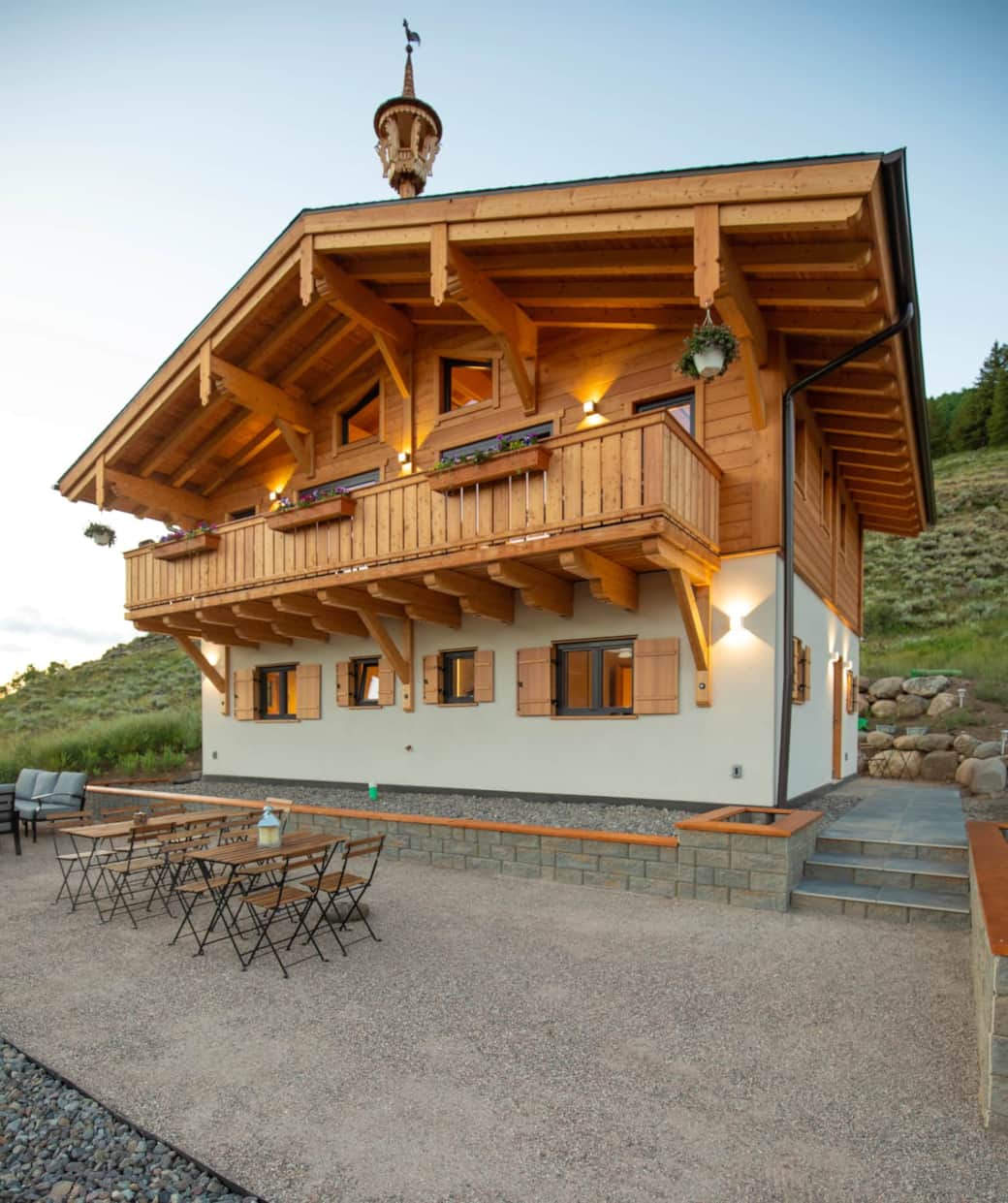 Chalet Homestake View was constructed in a workshop in Bramberg, Austria, by Holzbau Maier, then shipped and assembled on site. This 1,800 sq ft chalet blends Austrian larch cladding, a gabled roof with generous eaves, and a whimsical glockendome bell tower with a copper rooster.