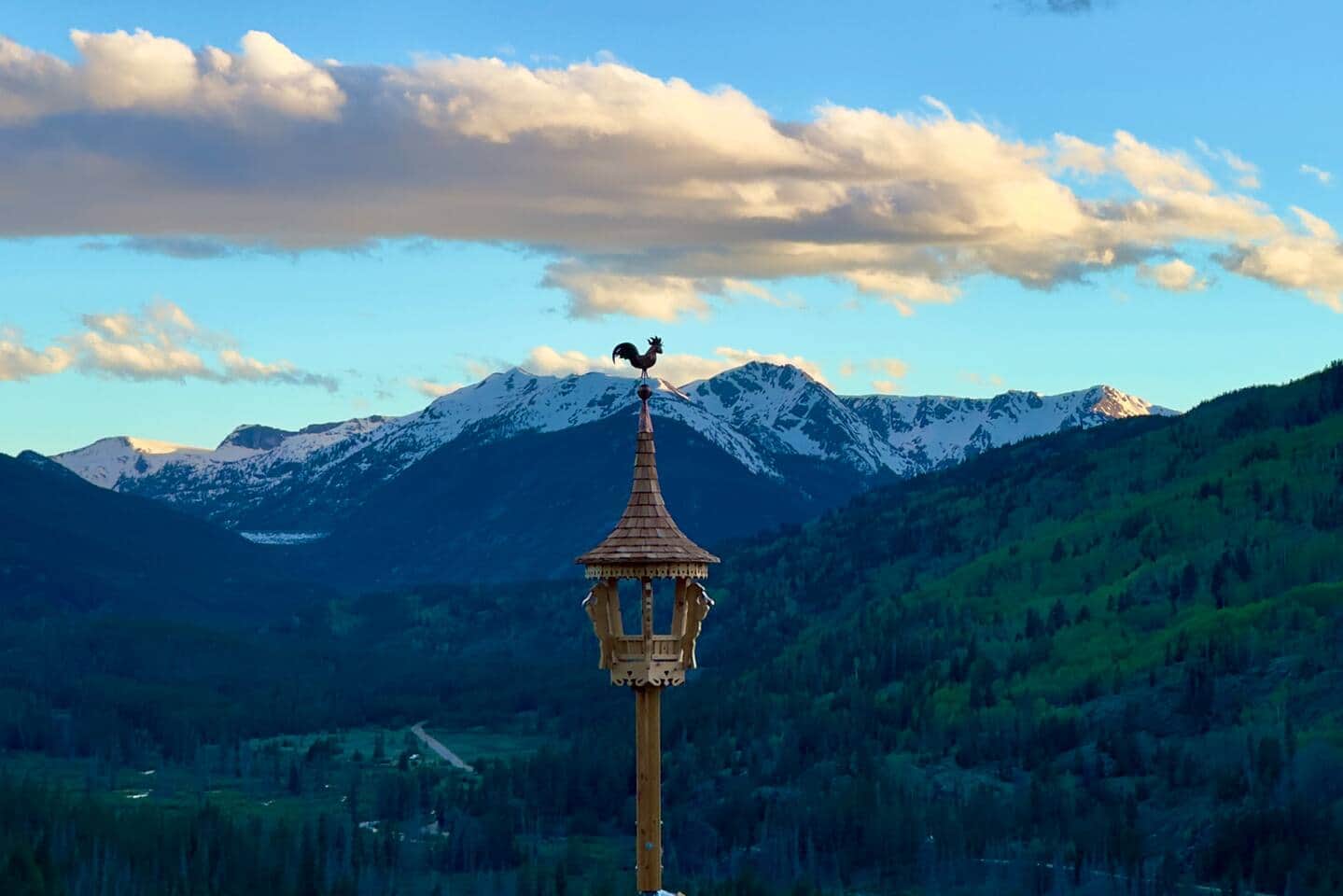 Outdoor Amenities: A wide wood balcony with carved slats, brackets, and flower boxes affords panoramic mountain views. On the ground level, an authentic Biergarten awaits with flexible seating options, a grill, Hammerschlagen, and a fire feature for preparing S’mores.